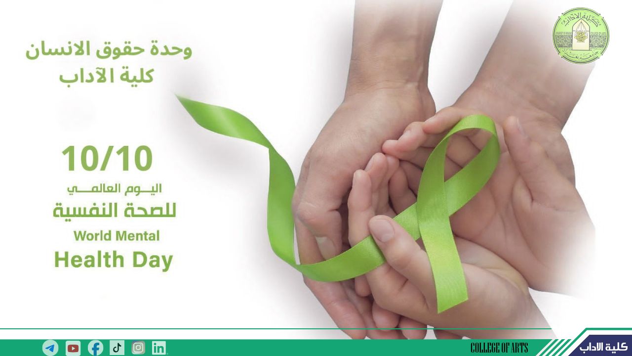انطلاقًا من رسالة عمادة كلية الآداب – جامعة بغداد في تعزيز الوعي الإنساني والاجتماعي، أكدت وحدة حقوق الإنسان في كلية الآداب – جامعة بغداد على أهمية الصحة النفسية باعتبارها حقًا أساسيًا من حقوق الإنسان، لا يقل شأنًا عن الصحة الجسدية، مشيرة إلى أن الصحة النفسية تشكّل ركيزة رئيسية للتنمية المستدامة، والإنتاج العلمي، وبناء مجتمع جامعي متفاعل وإيجابي.