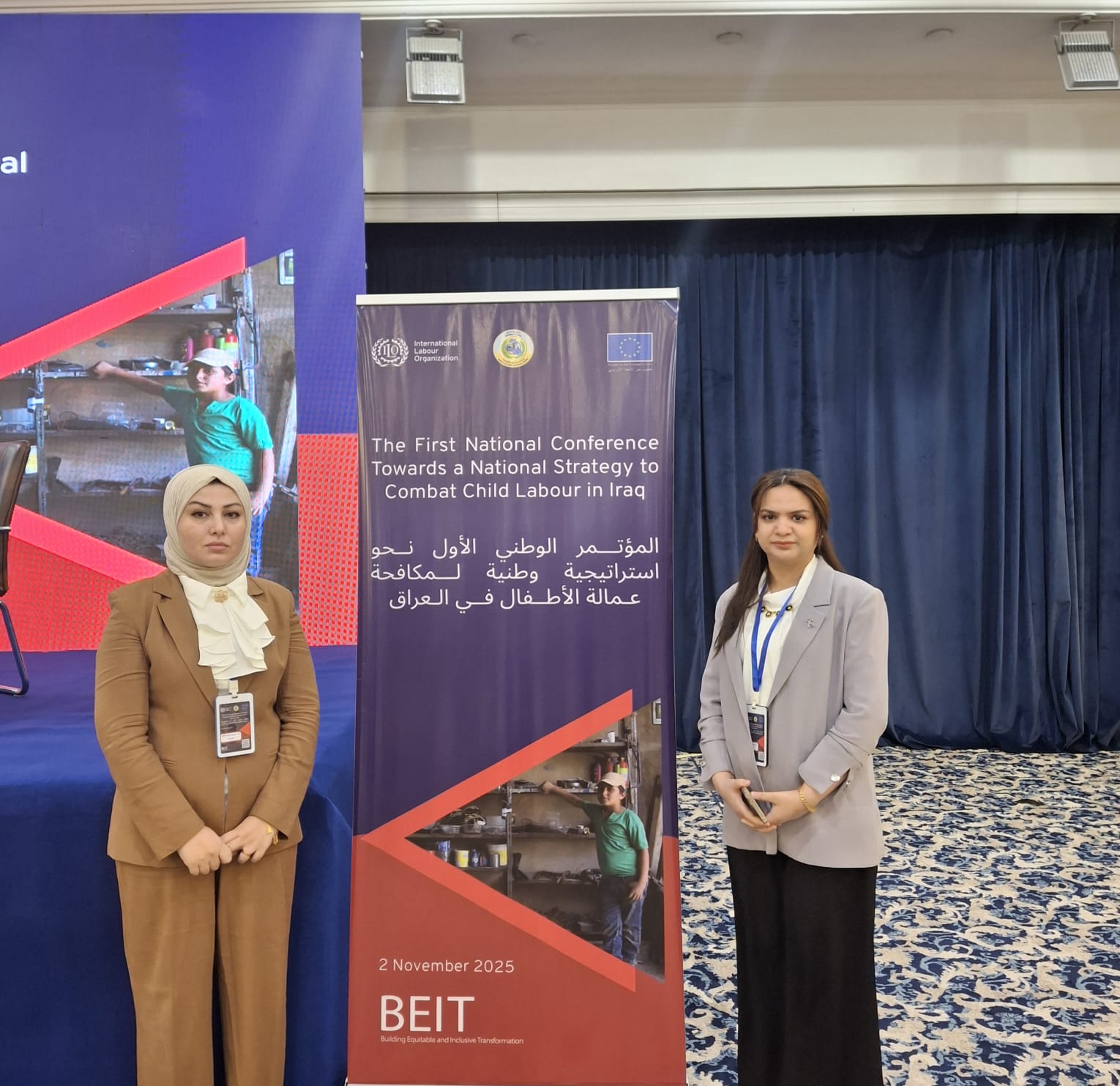 شارك التدريسيتان المدرس الدكتورة سمر سعدي خميس والمدرس الدكتورة شيرين محمد كاظم من جامعة بغداد / كلية الآداب / قسم علم الاجتماع، في المؤتمر الوطني الأول الموسوم: (نحو استراتيجية وطنية لمكافحة أسوأ أشكال عمالة الأطفال في العراق)، الذي أُقيم بالتعاون بين منظمة العمل الدولية ووزارة التخطيط، وذلك على قاعة فندق المنصور في بغداد بتاريخ 2 تشرين الثاني 2025.