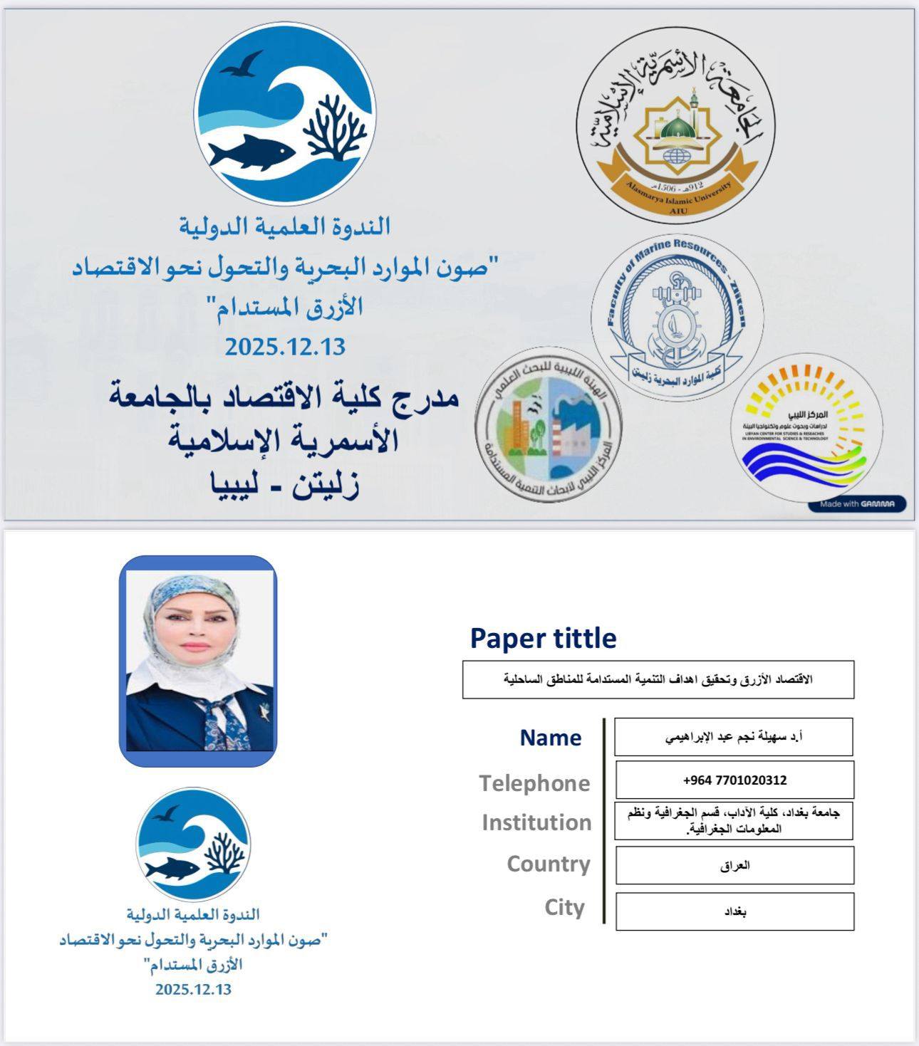 شاركت التدريسية في كلية الآداب بجامعة بغداد، الأستاذة الدكتورة سهيلة نجم عبد الإبراهيمي، التدريسية في قسم الجغرافية، في الندوة العلمية الدولية التي نظمتها كلية الموارد البحرية بالجامعة الأسمرية الإسلامية، بالتعاون مع المركز الليبي لدراسات وبحوث علوم وتكنولوجيا البيئة / فرع المنطقة الوسطى، والمركز الليبي لأبحاث التنمية المستدامة / فرع زليتن.